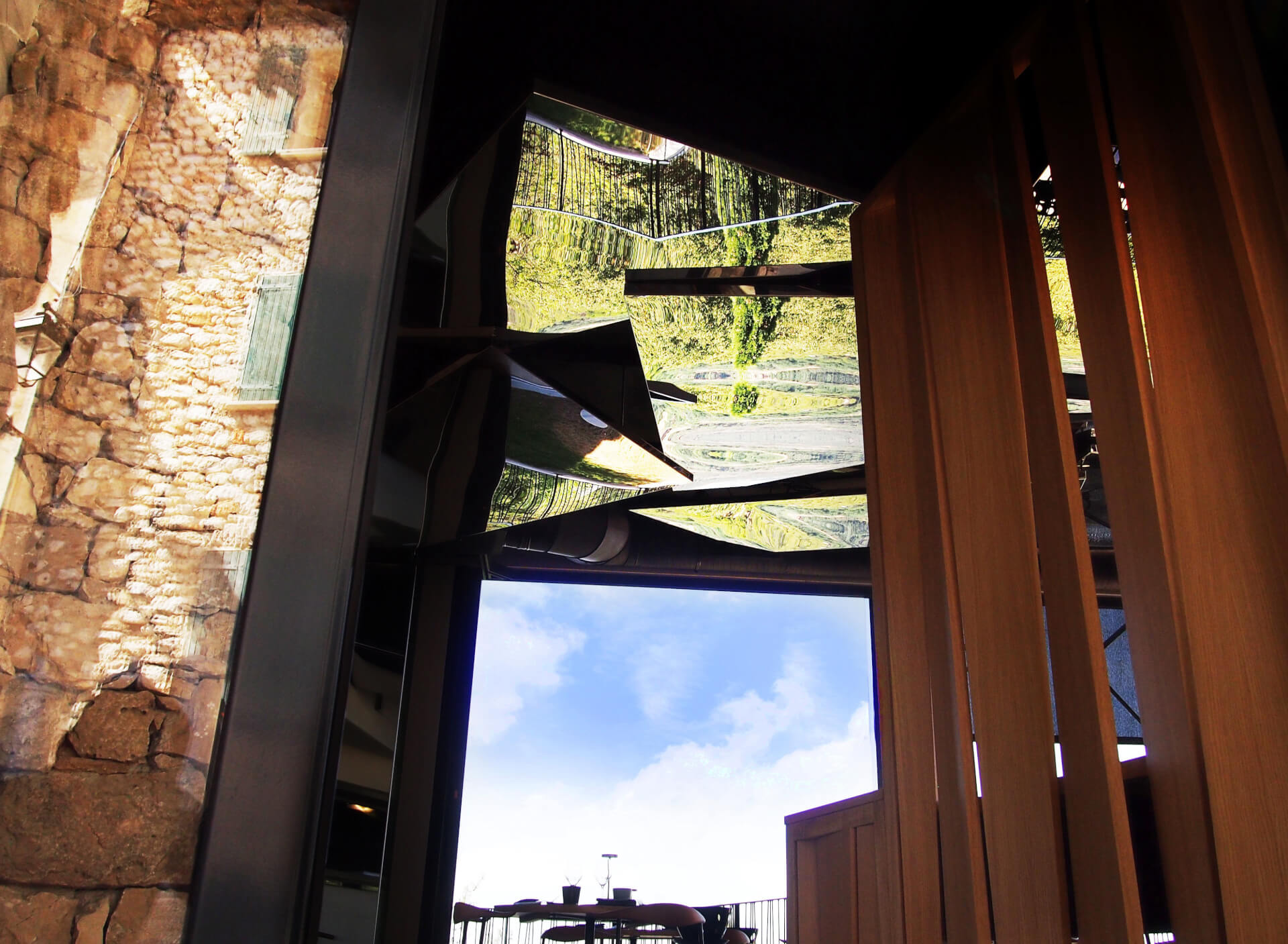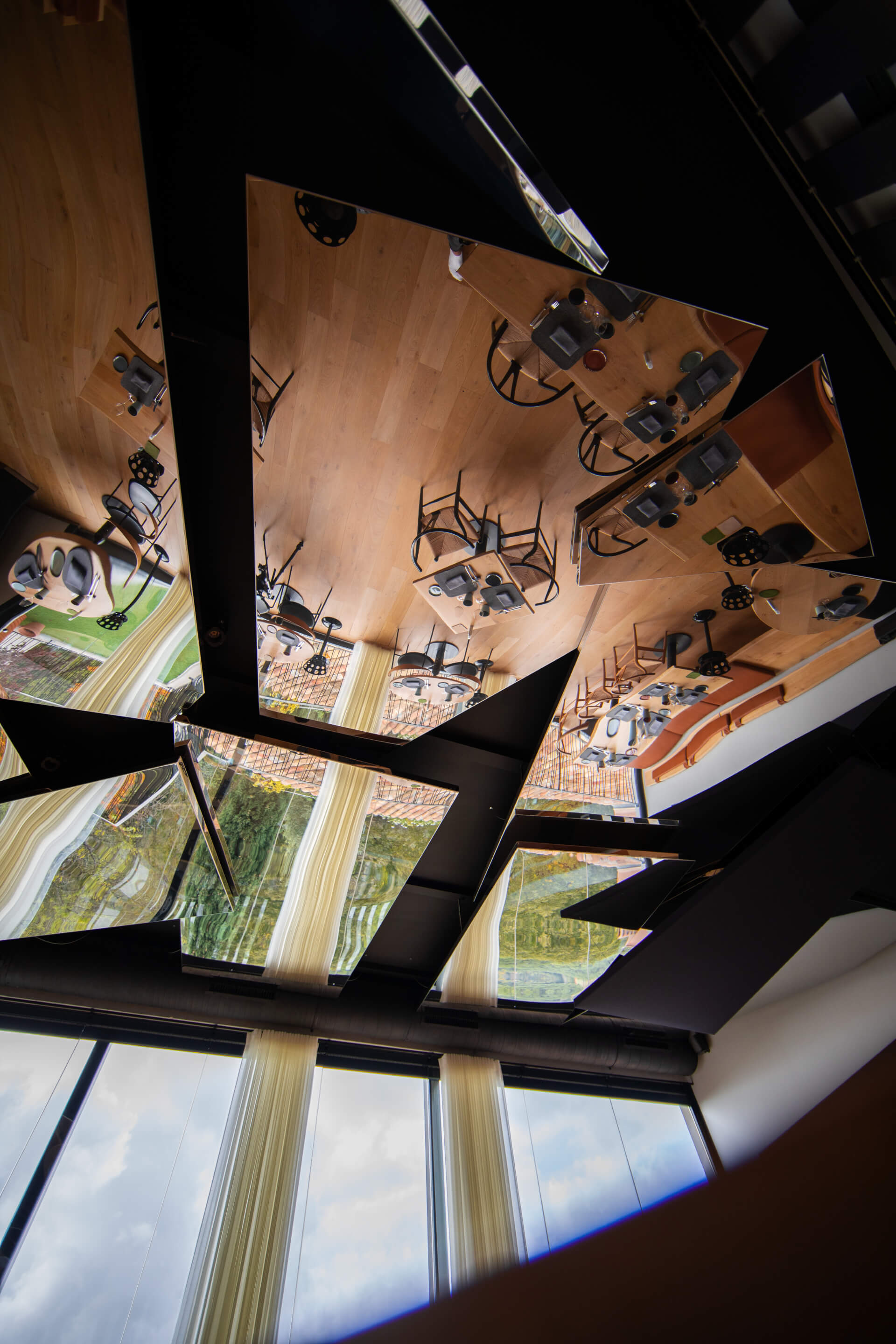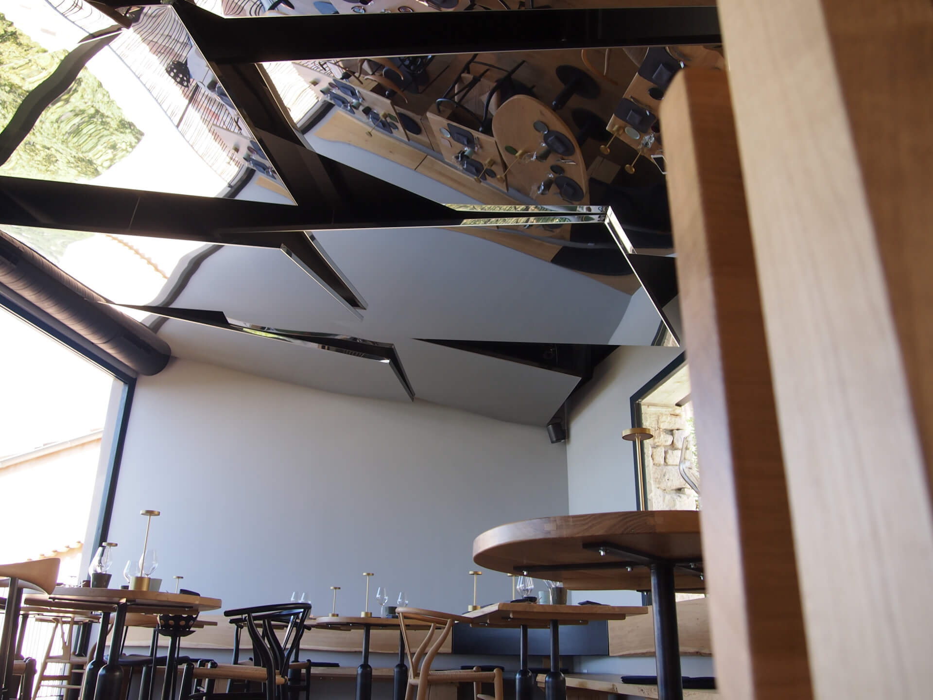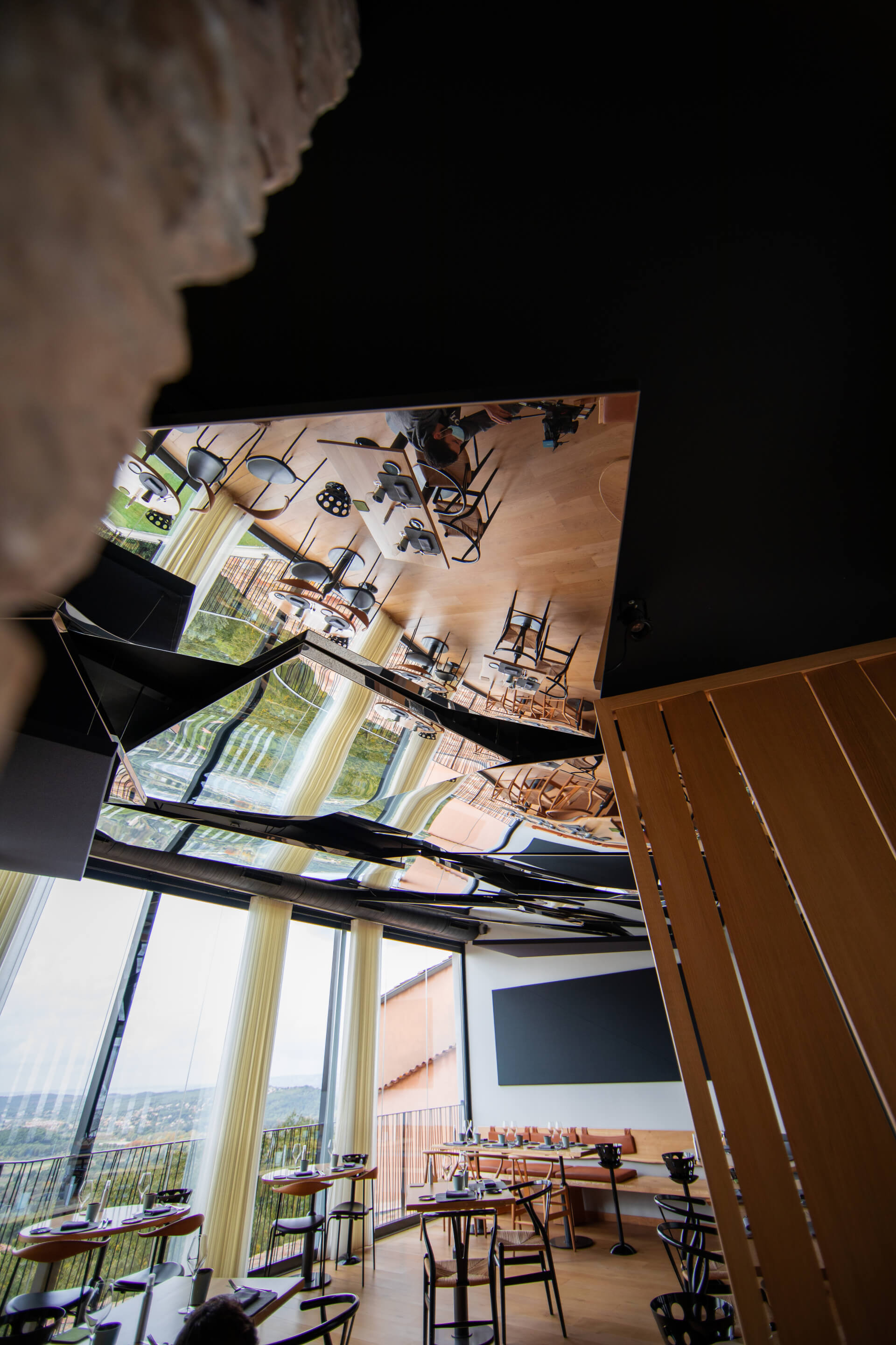 Pièce maîtresse du restaurant, le plafond aux déroutantes formes géométriques, en inox poli miroir fait usage de … miroir. Les convives dos à la vue peuvent ainsi profiter du panorama extérieur. Entre le paysage, les ouvertures donnant sur le village et la cuisine ouverte du chef, rien n’échappe aux reflets du plafond.