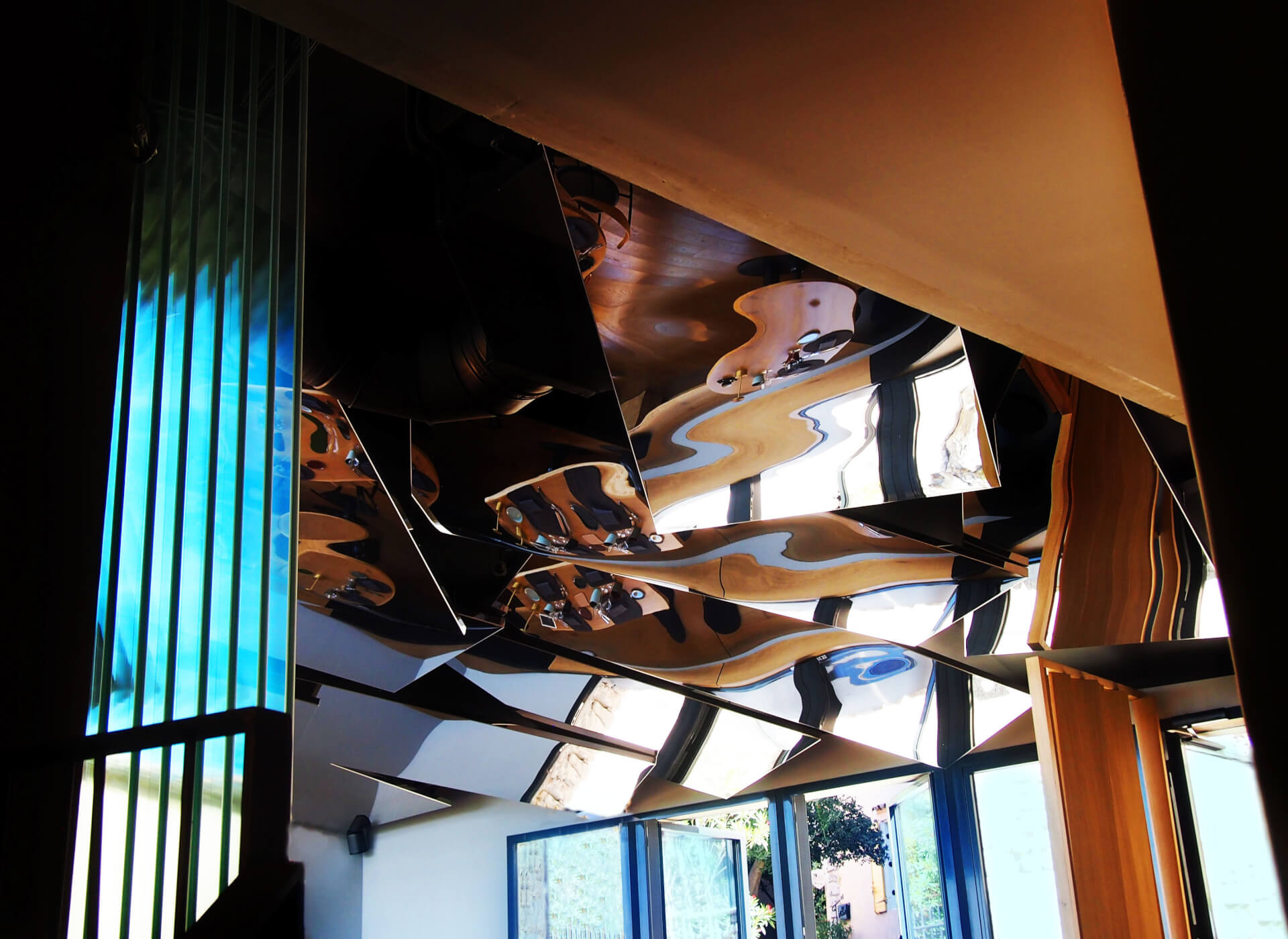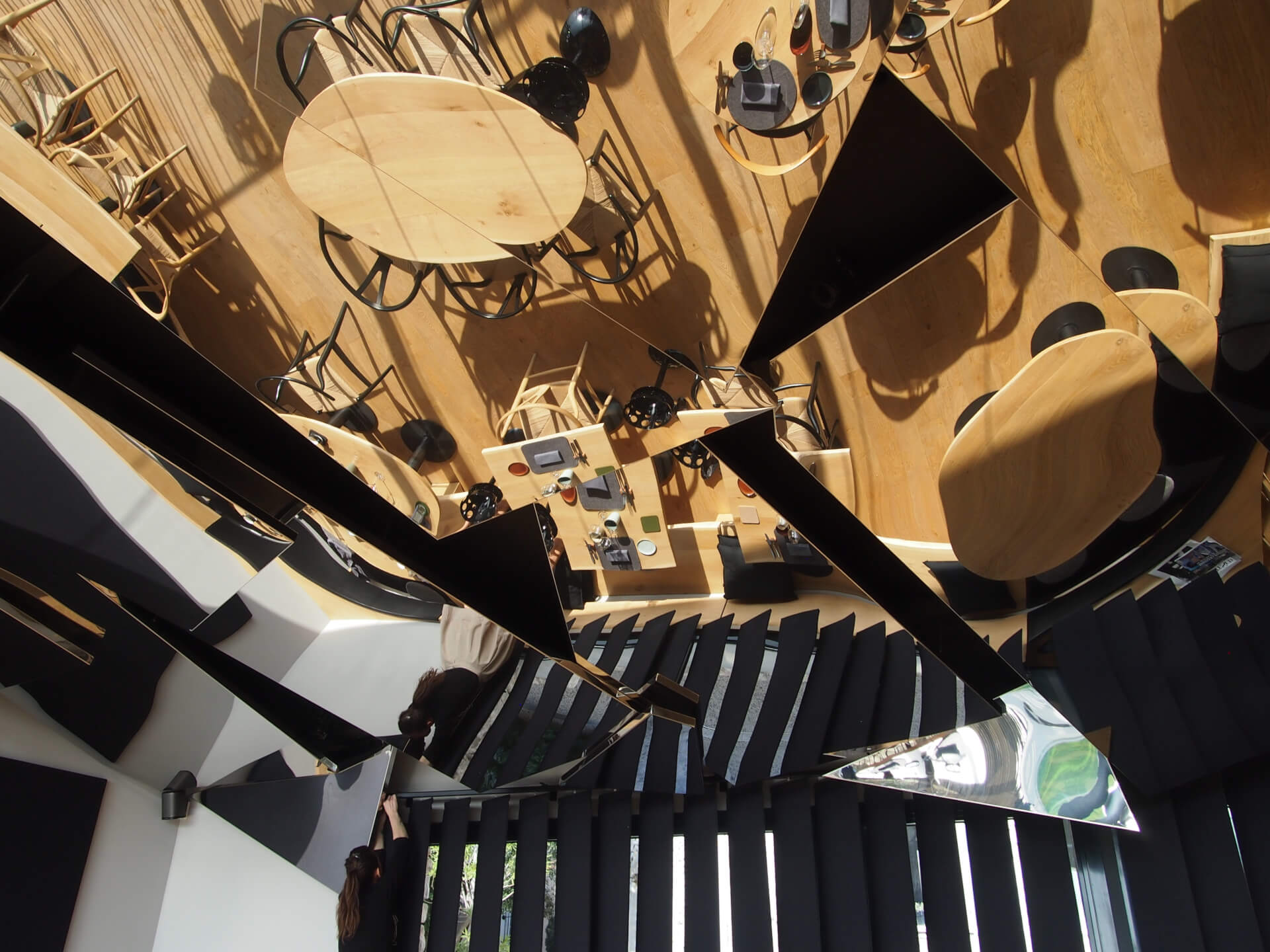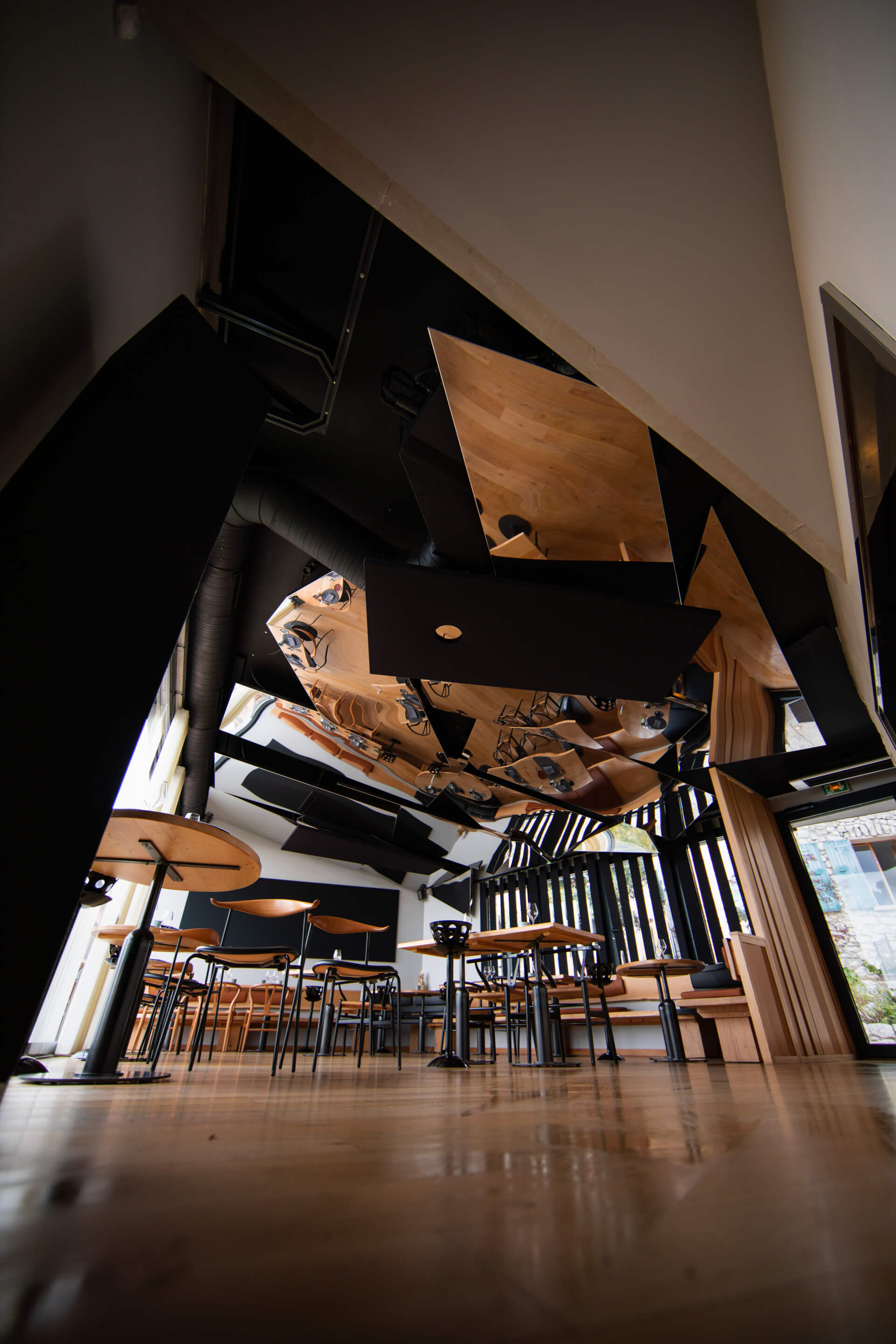 Pièce maîtresse du restaurant, le plafond aux déroutantes formes géométriques, en inox poli miroir fait usage de … miroir. Les convives dos à la vue peuvent ainsi profiter du panorama extérieur. Entre le paysage, les ouvertures donnant sur le village et la cuisine ouverte du chef, rien n’échappe aux reflets du plafond.