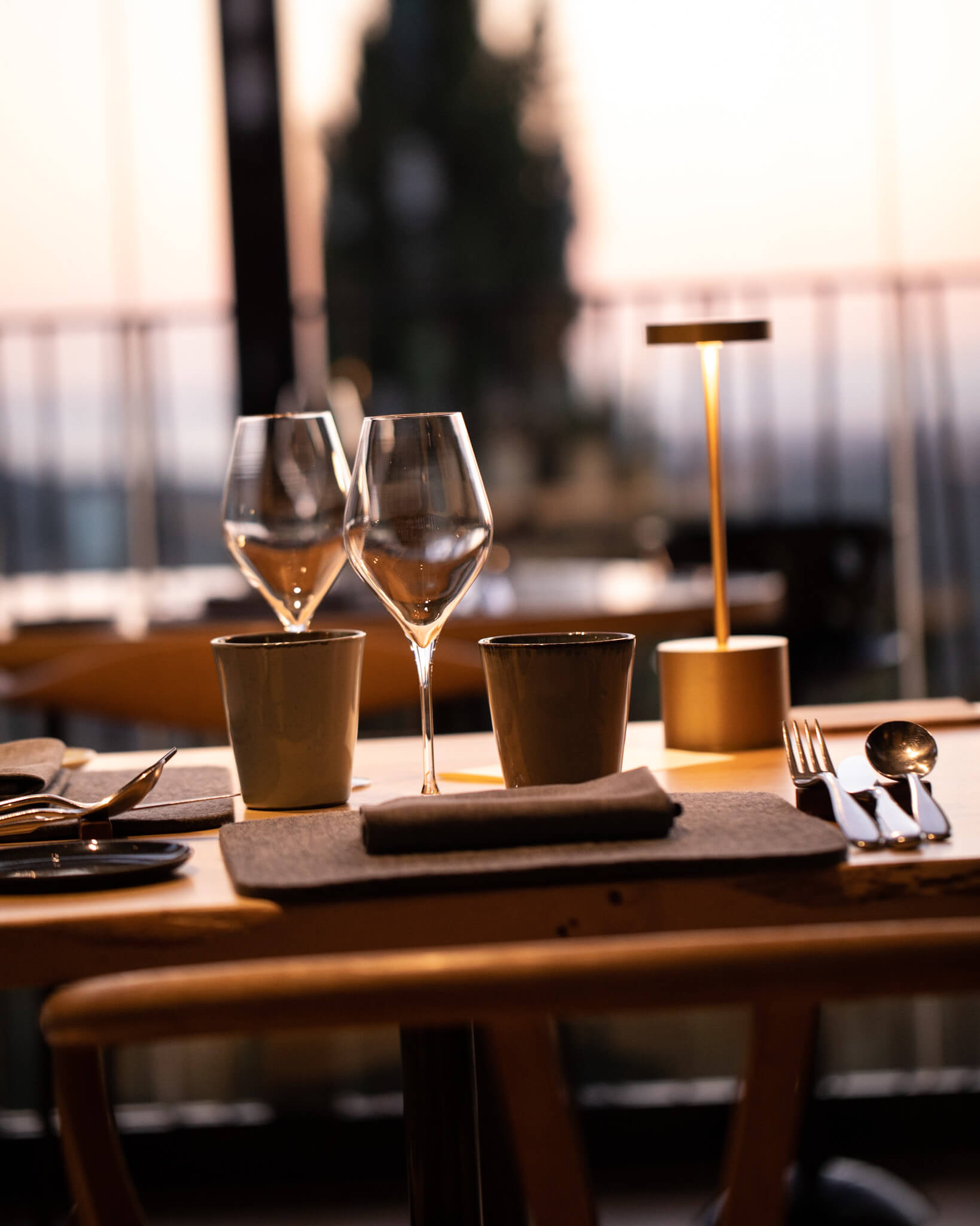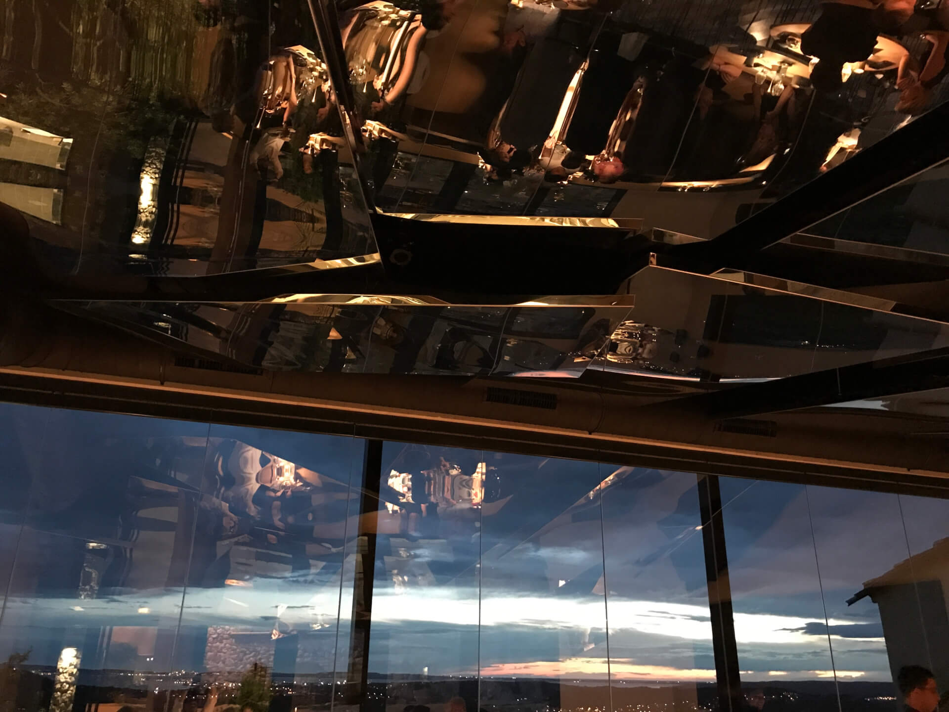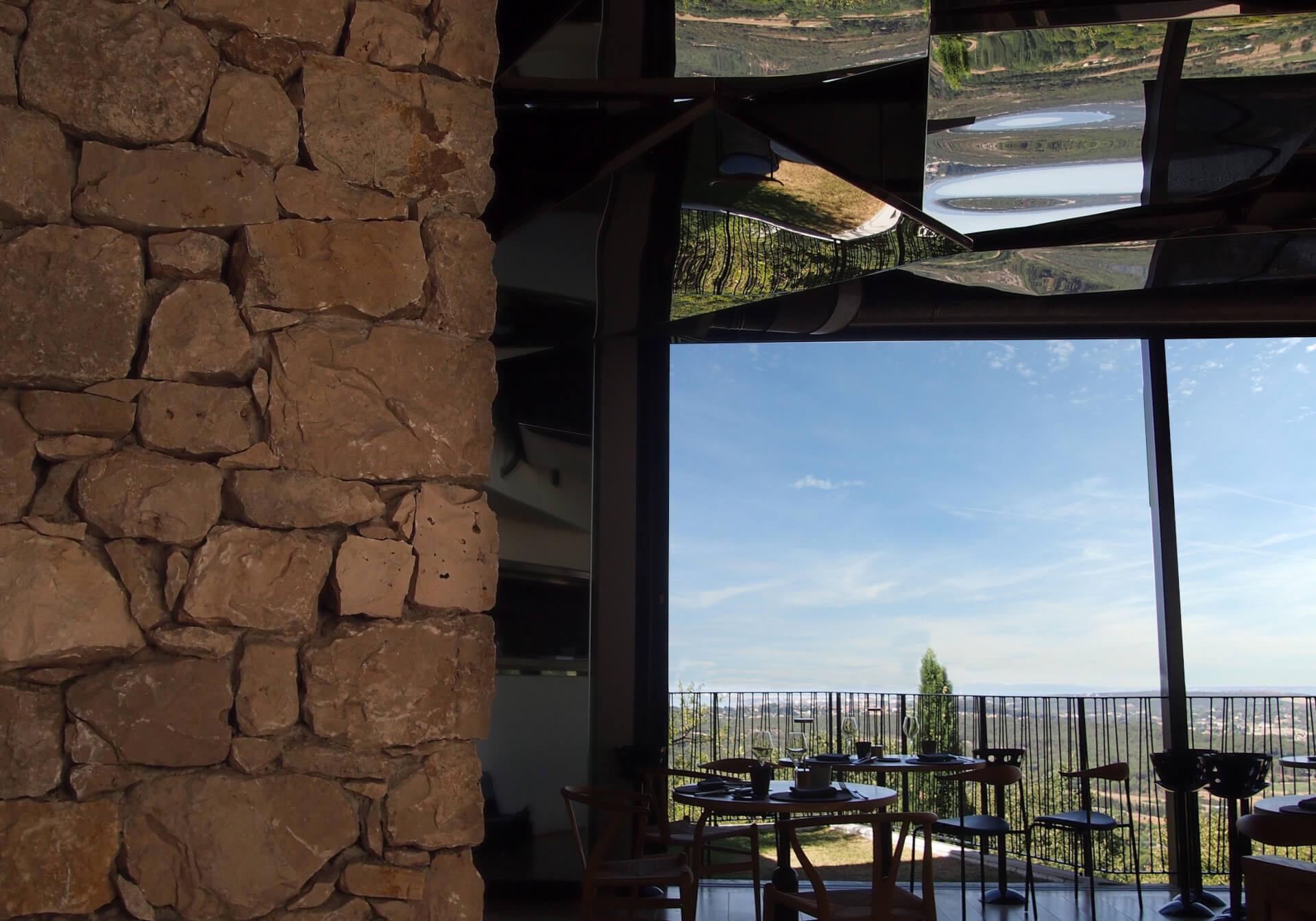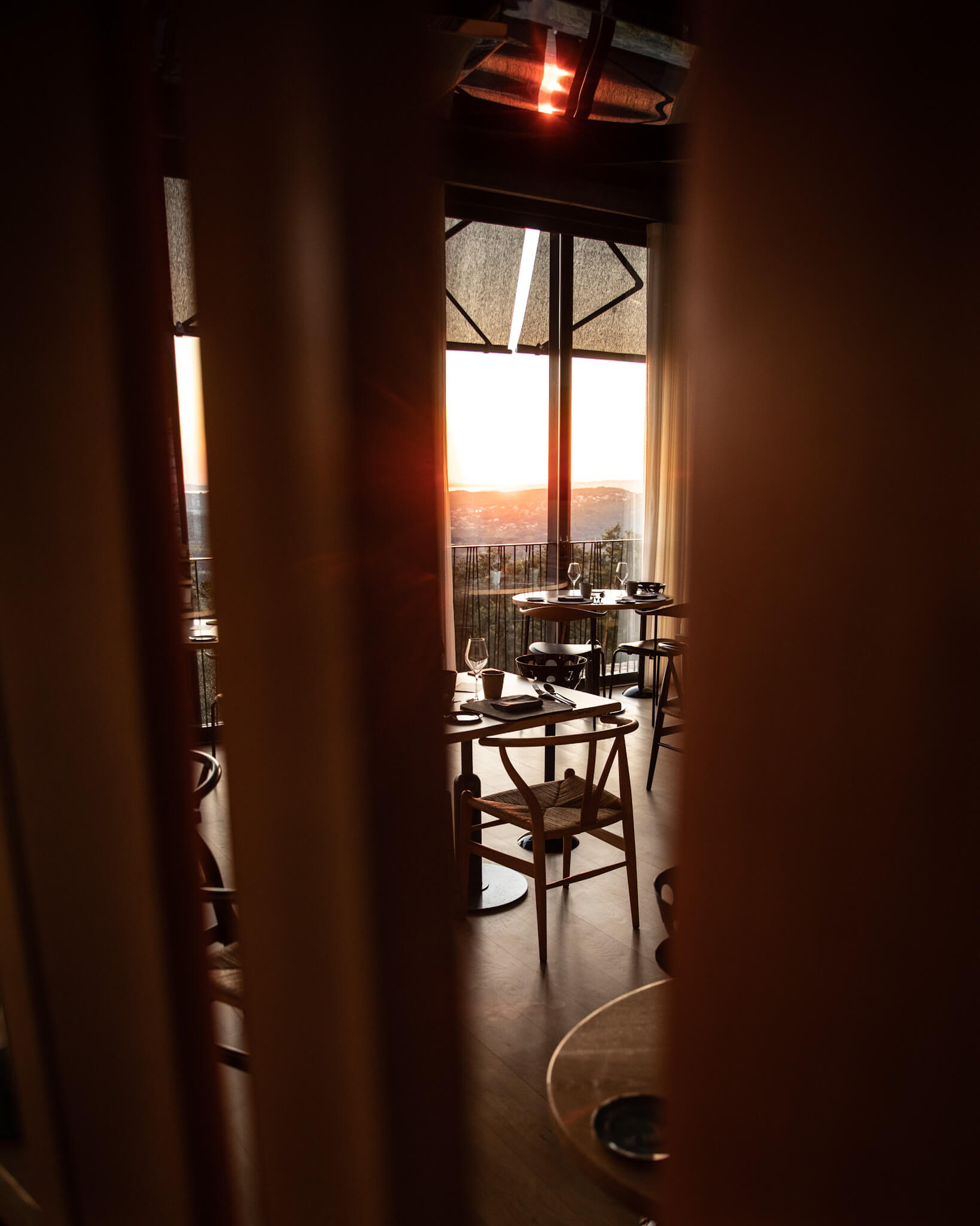 Pièce maîtresse du restaurant, le plafond aux déroutantes formes géométriques, en inox poli miroir fait usage de … miroir. Les convives dos à la vue peuvent ainsi profiter du panorama extérieur. Entre le paysage, les ouvertures donnant sur le village et la cuisine ouverte du chef, rien n’échappe aux reflets du plafond.