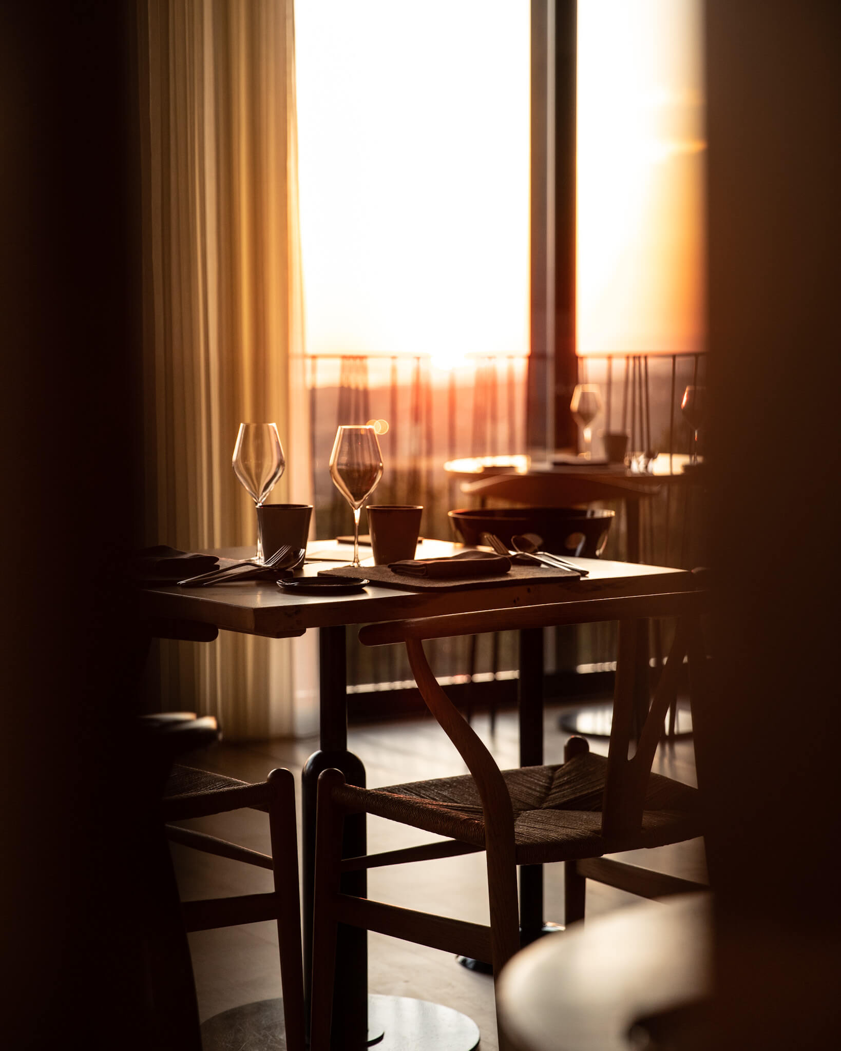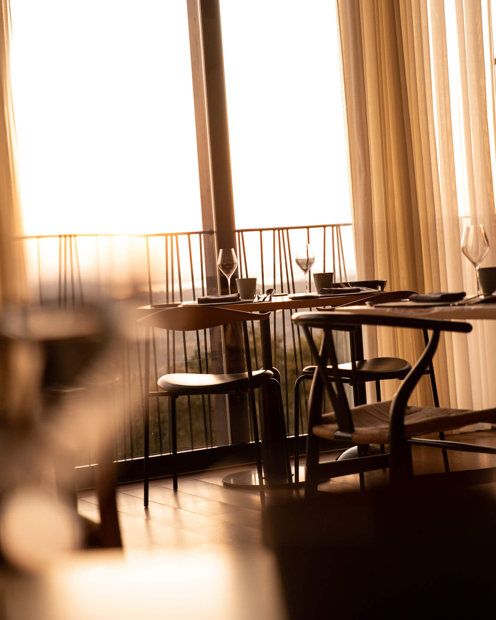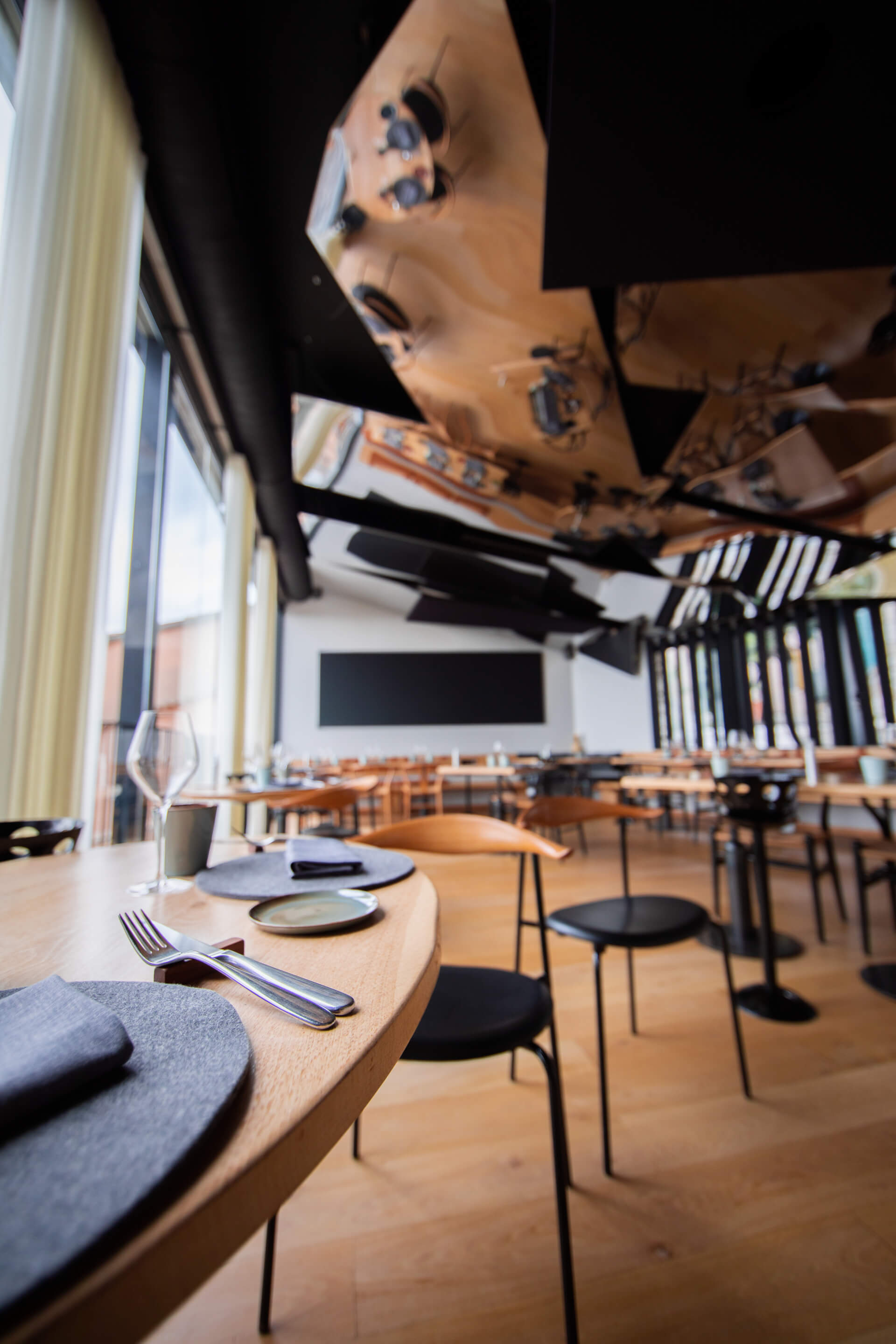 L'aménagement mêlant cuirs, bois et bétons est teinté d'une tonalité scandinave, clin d’œil au séjour professionnel prolongé du Chef en Suède.